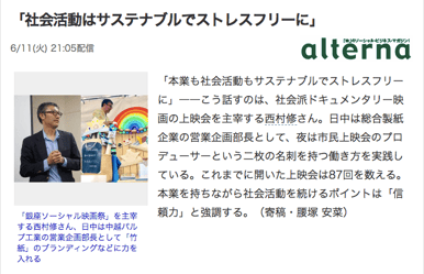 「自ら考えて行動する人」が増えれば、少しずつかもしれないが、世の中はきっと良くなる。「考えるきっかけ」をつくる「銀座ソーシャル映画祭」を参考に設立した「恵比寿シーシャル映画祭」「シネマベリ二子玉川」「ロータスシネマ」の主宰者らと共に、ドキュメンタリー映画の市民上映会を広げるために活動します。
